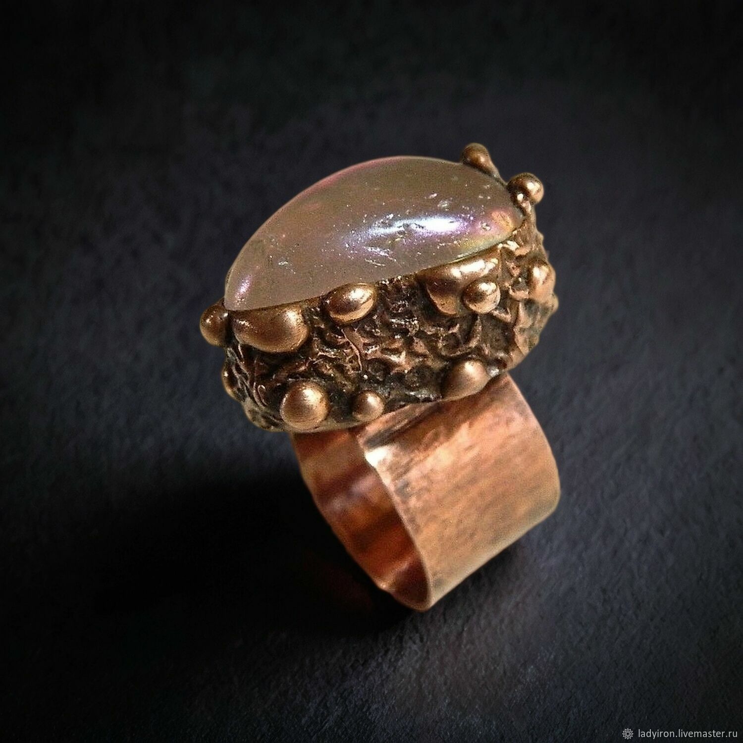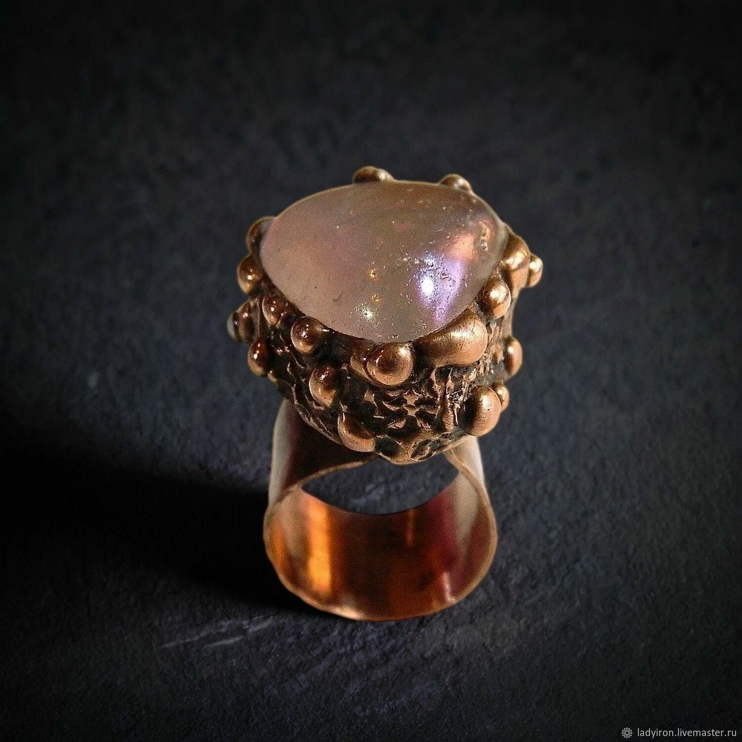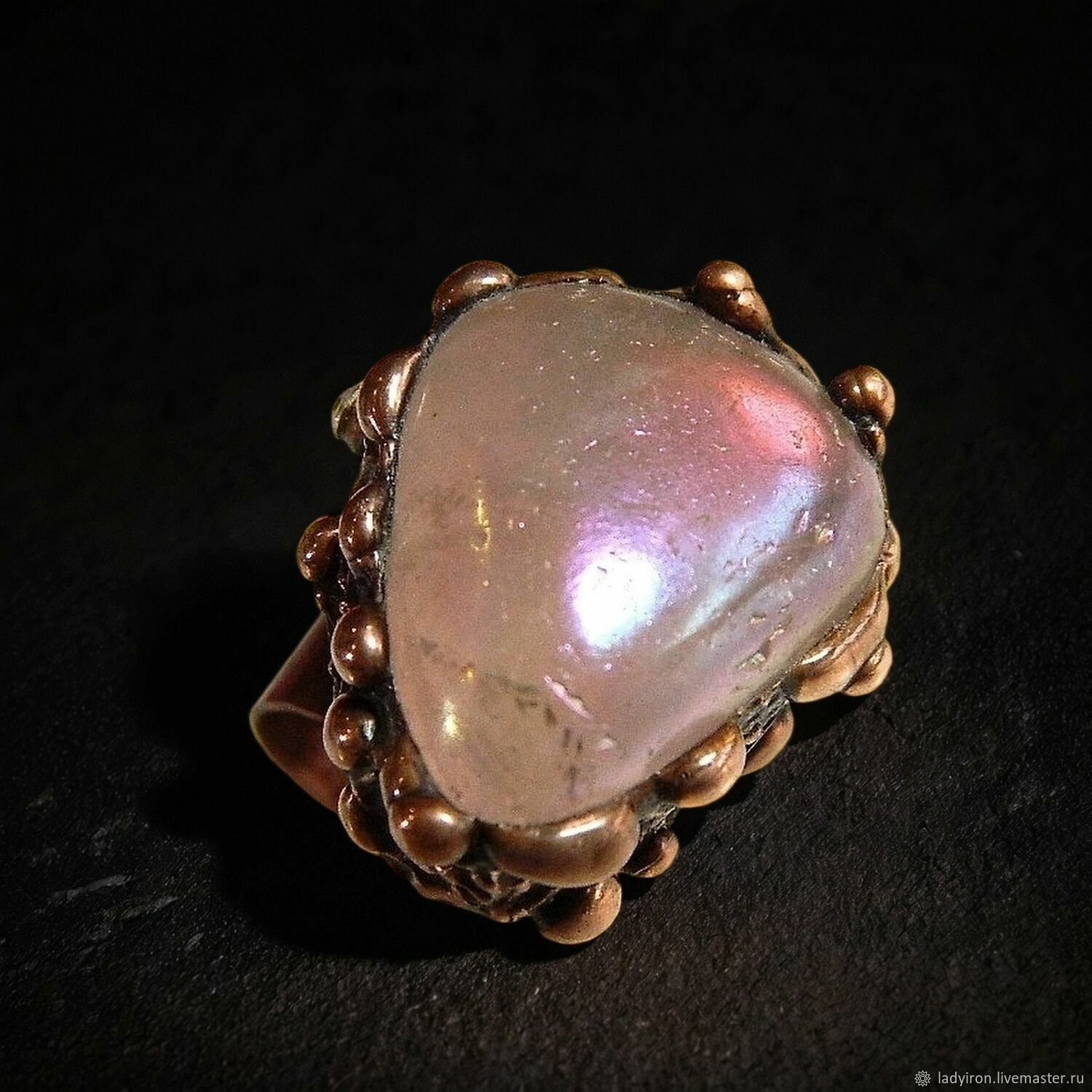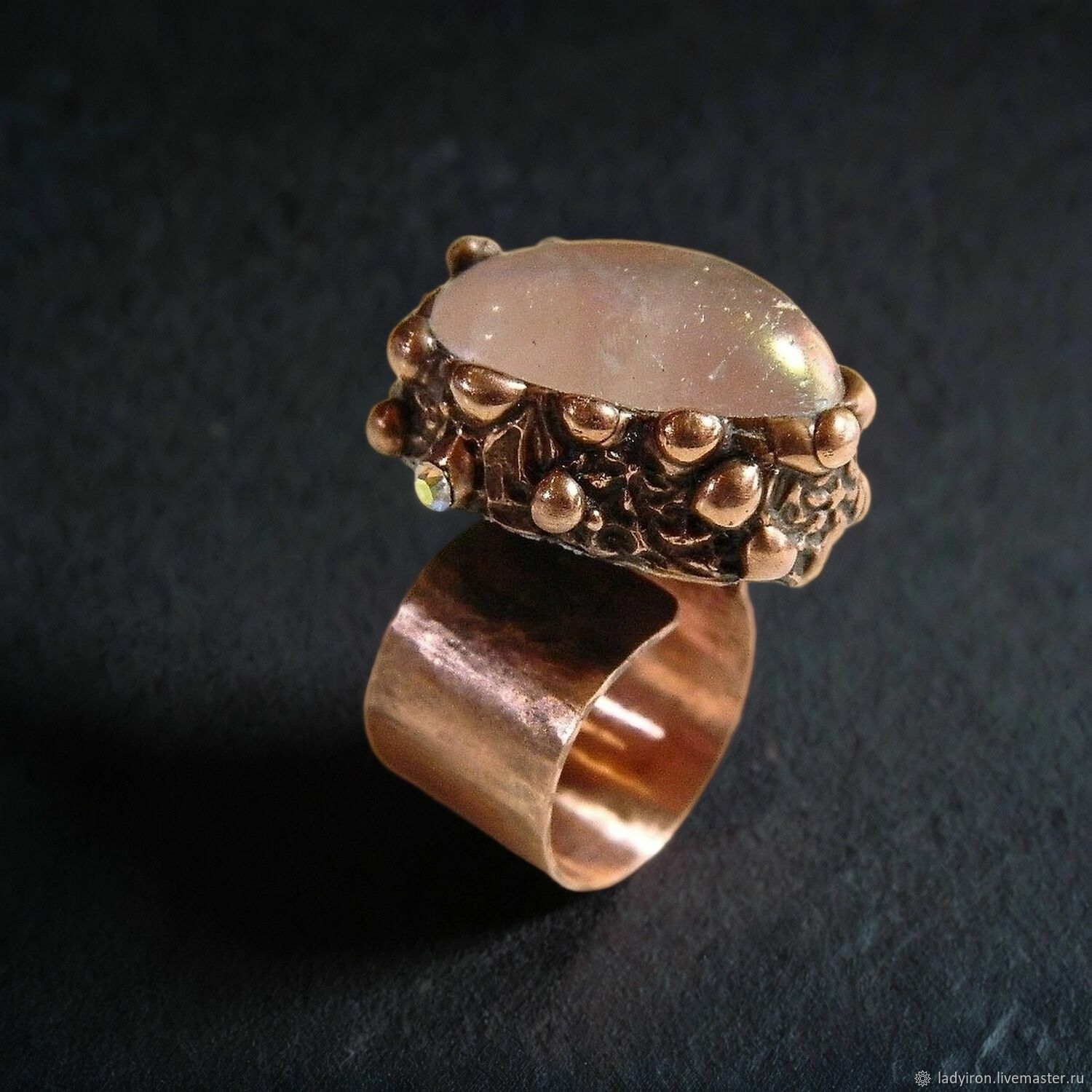 Материалы: розовый кварц с титановм напылением, медь, металлический сплав, патина
