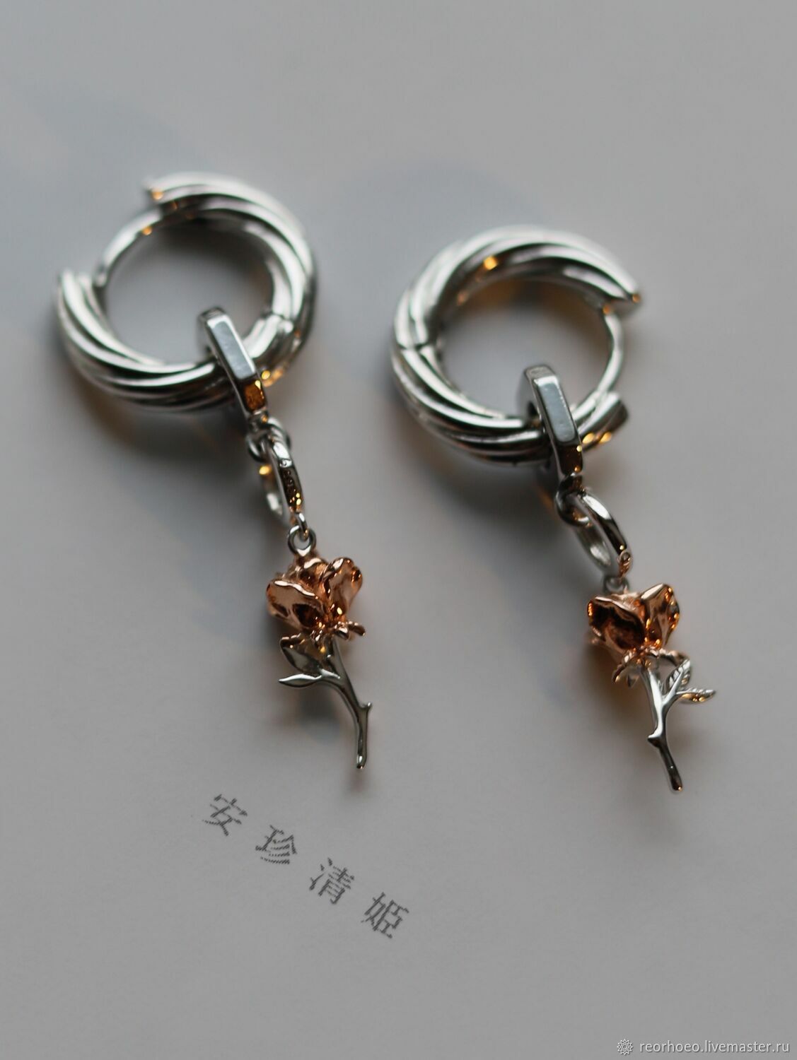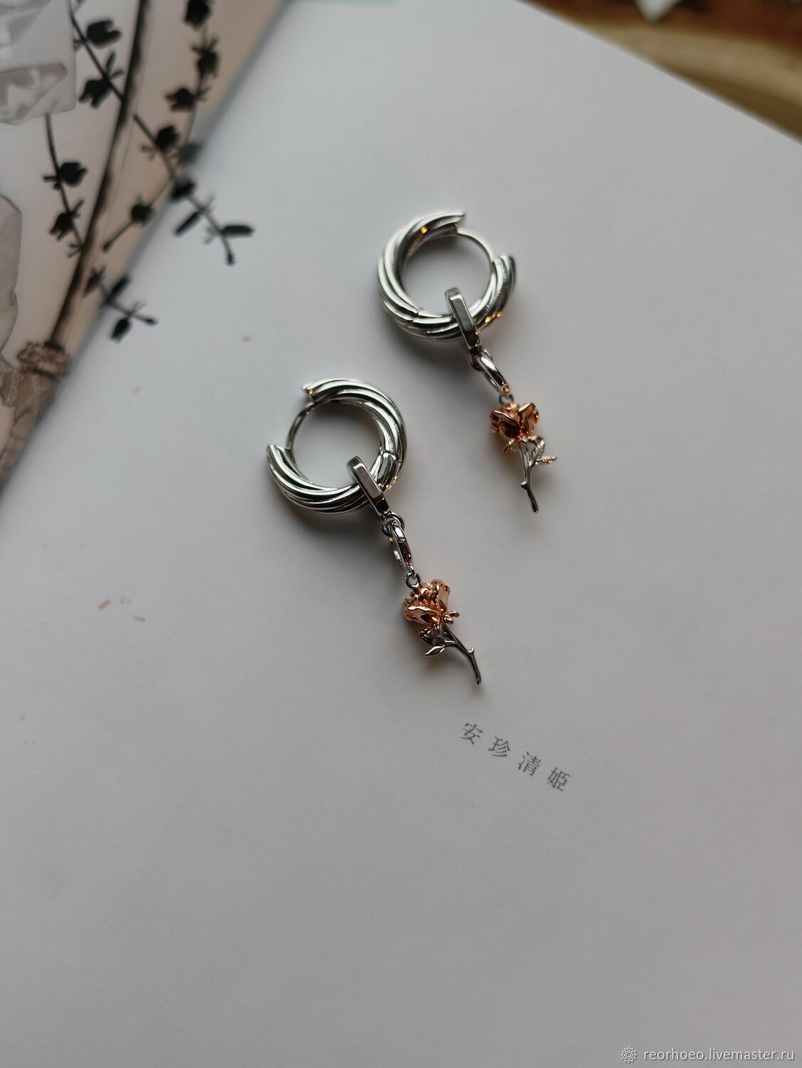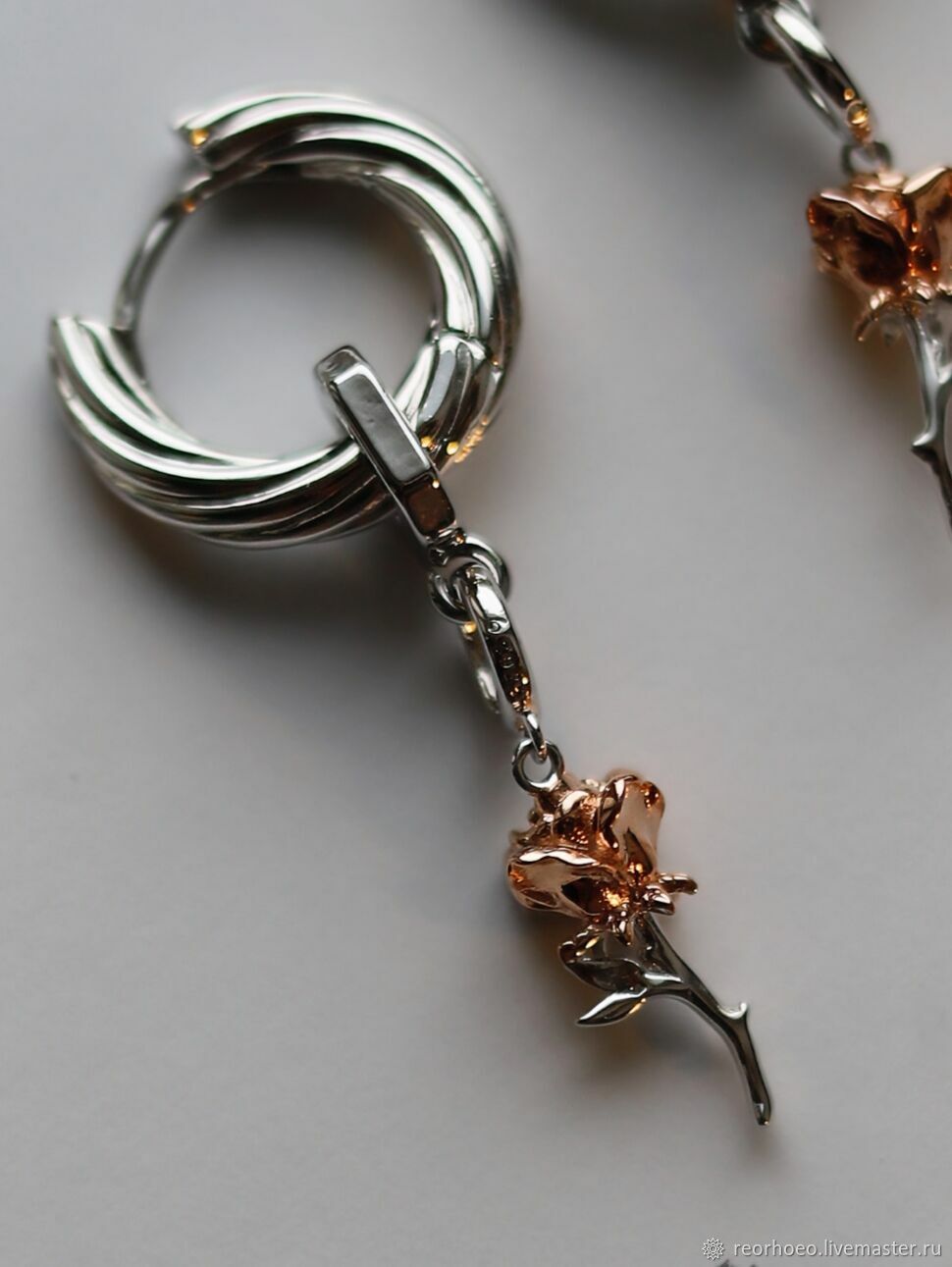 Со съёмными серебряными подвесками в виде утонченных роз, бутоны которых покрыты розовым золотом.