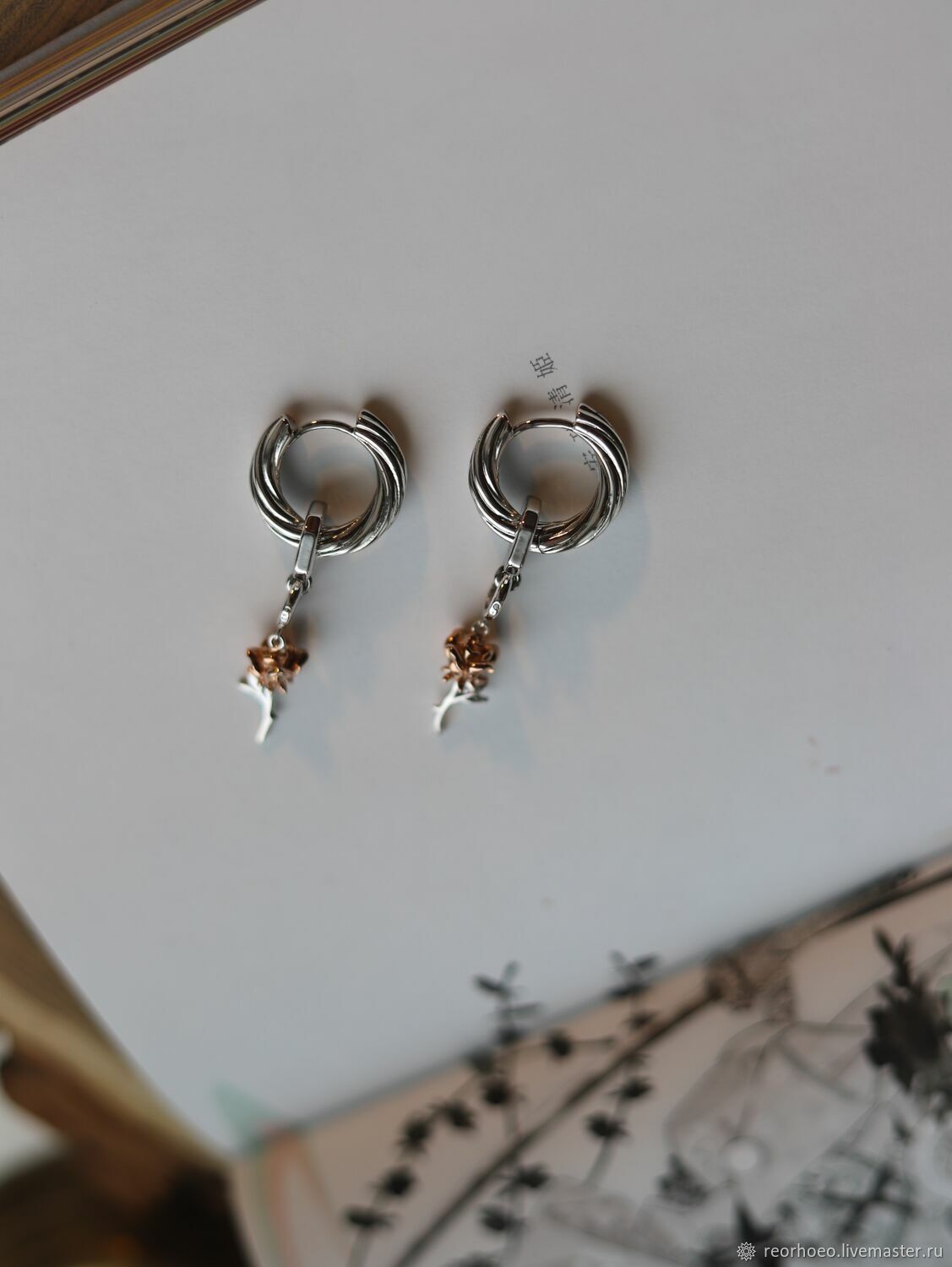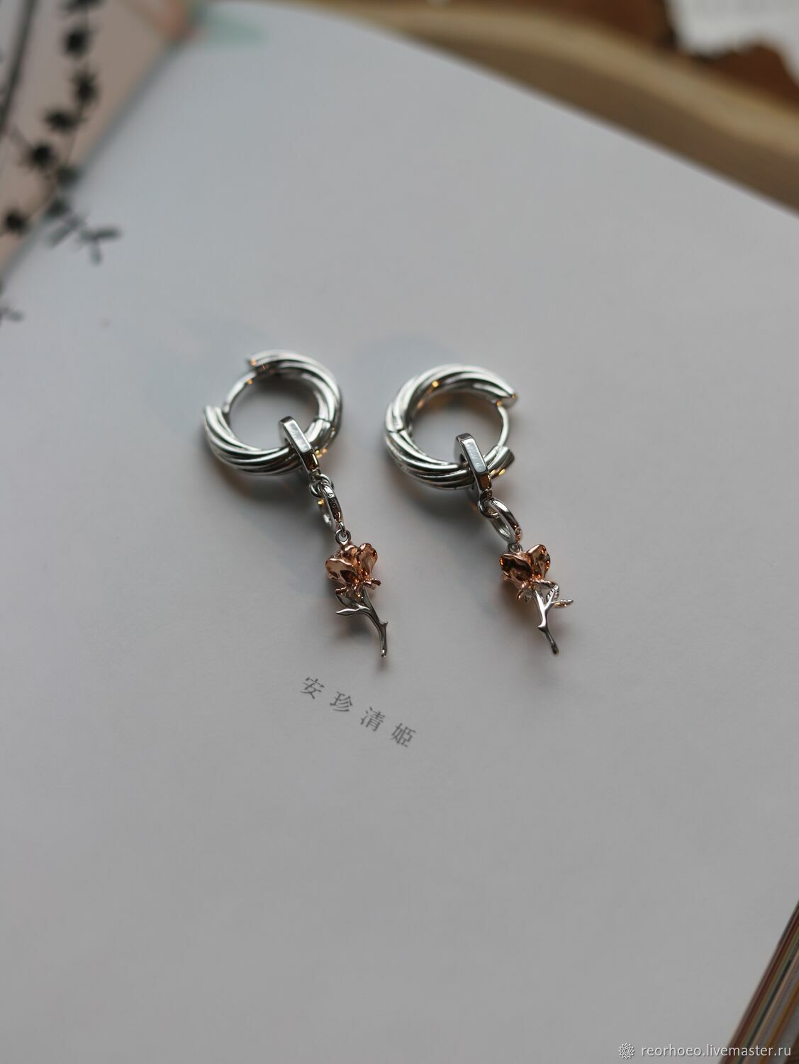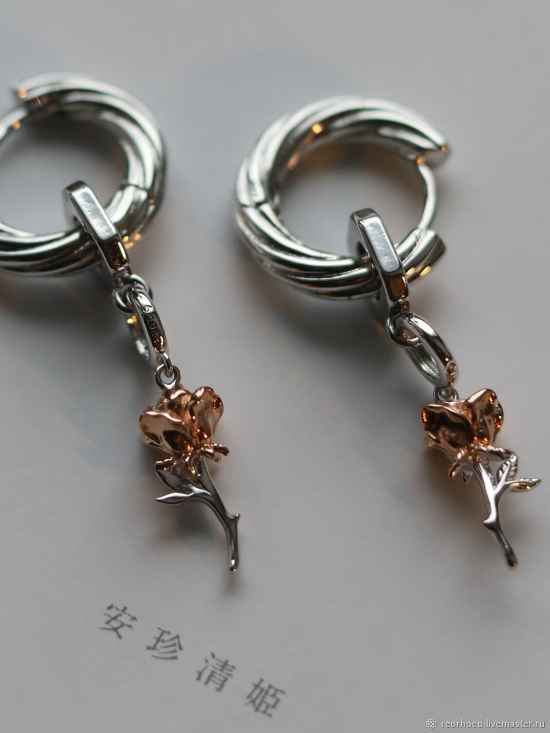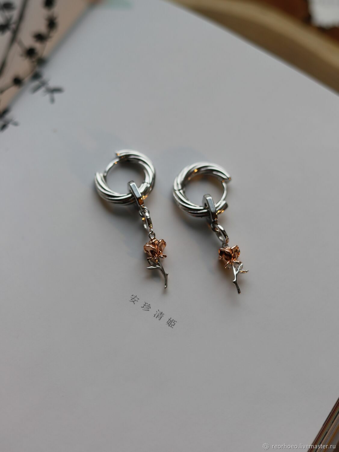 Со съёмными серебряными подвесками в виде утонченных роз, бутоны которых покрыты розовым золотом.